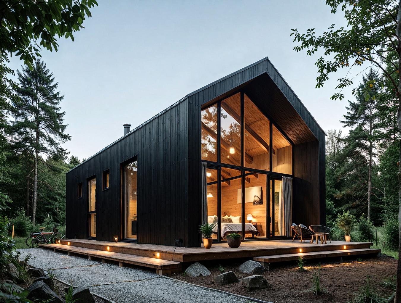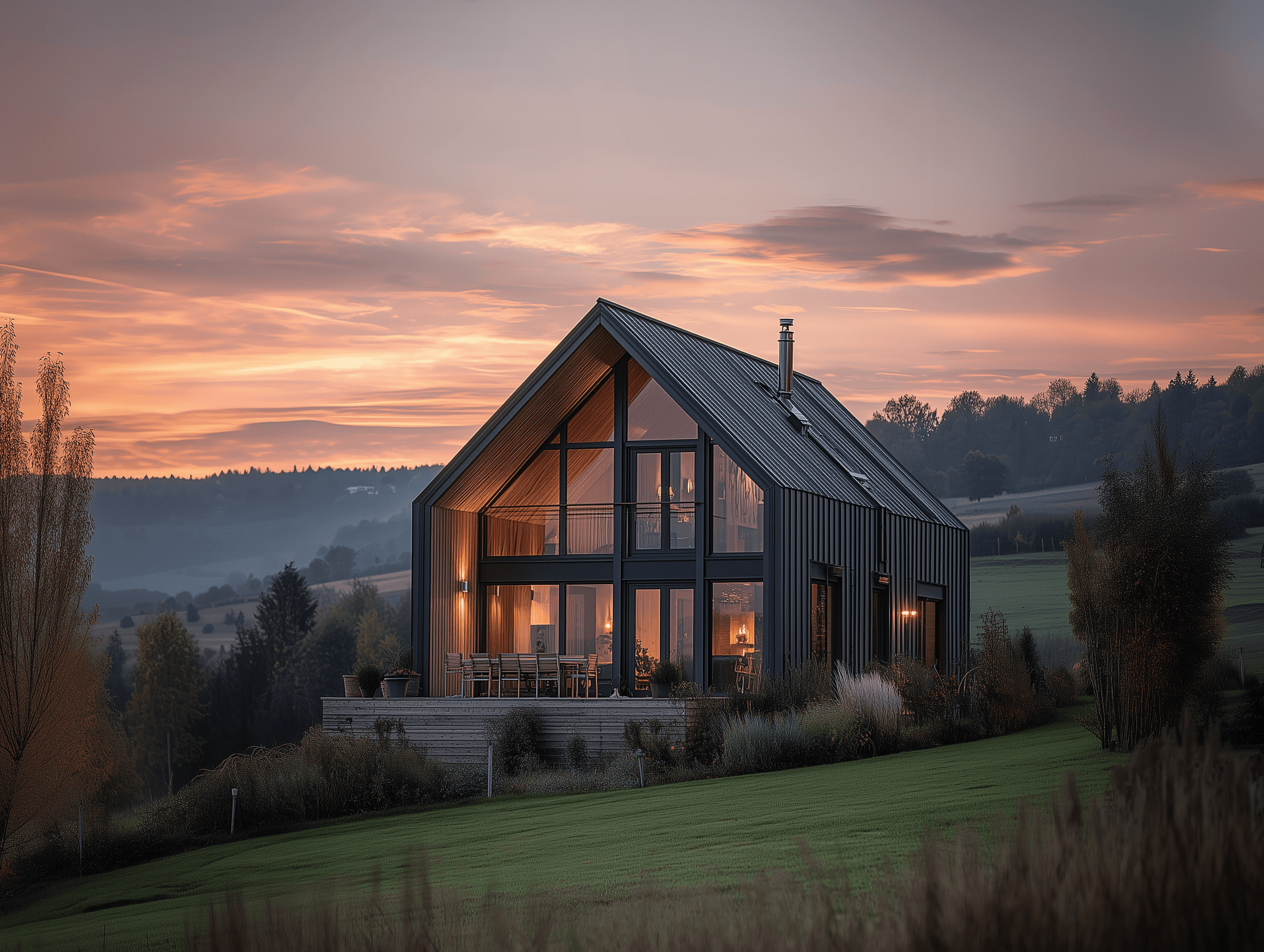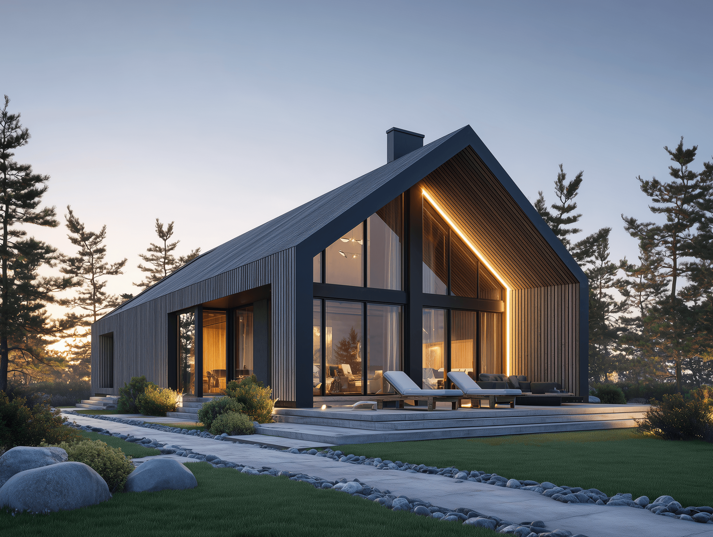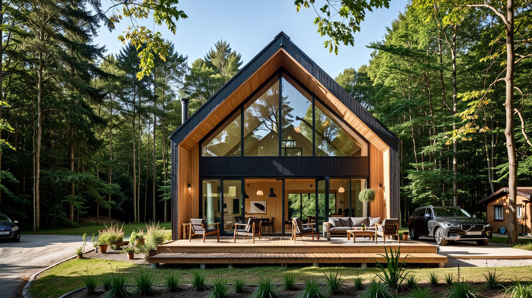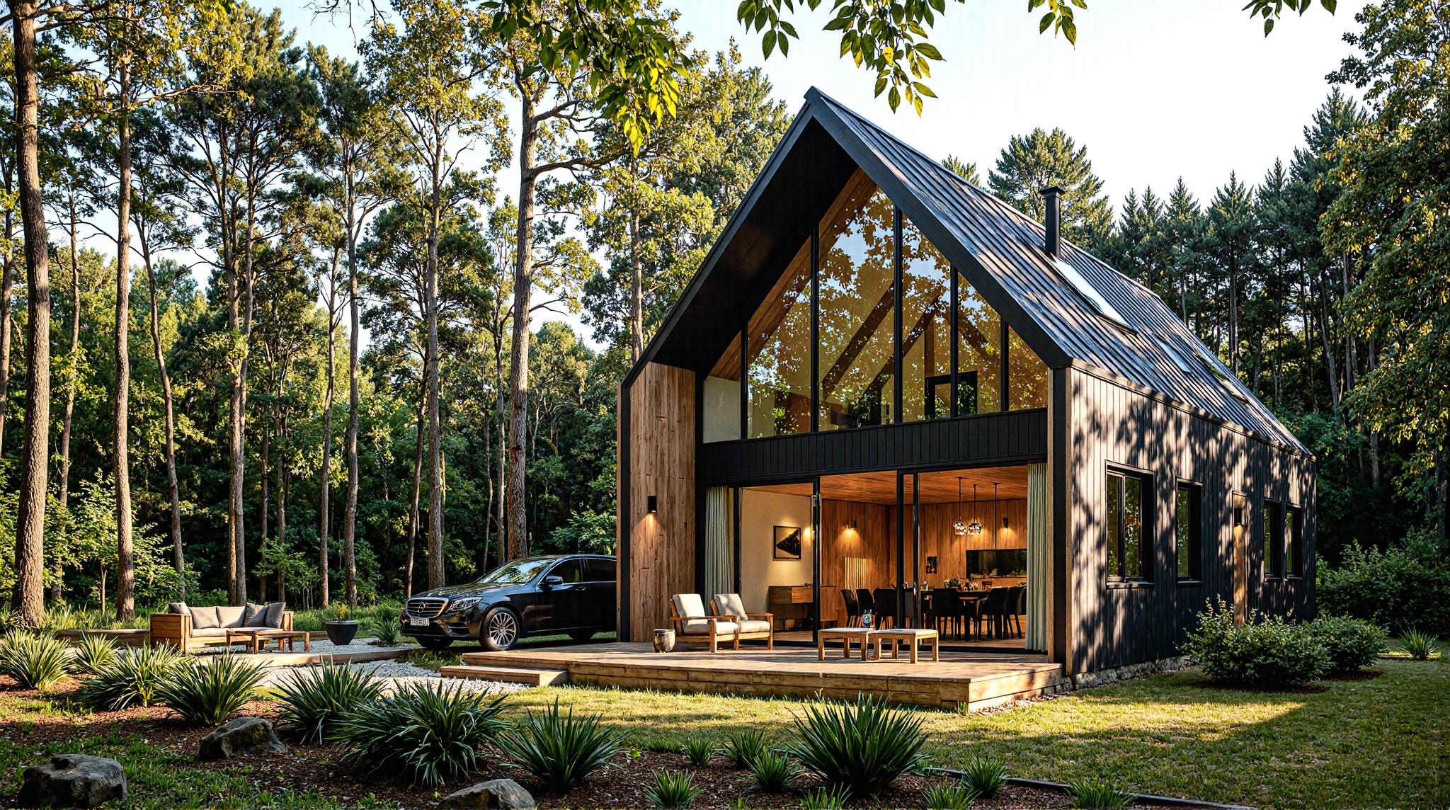 Minimalistyczna bryła z dużymi przeszkleniami – połączenie designu i natury.